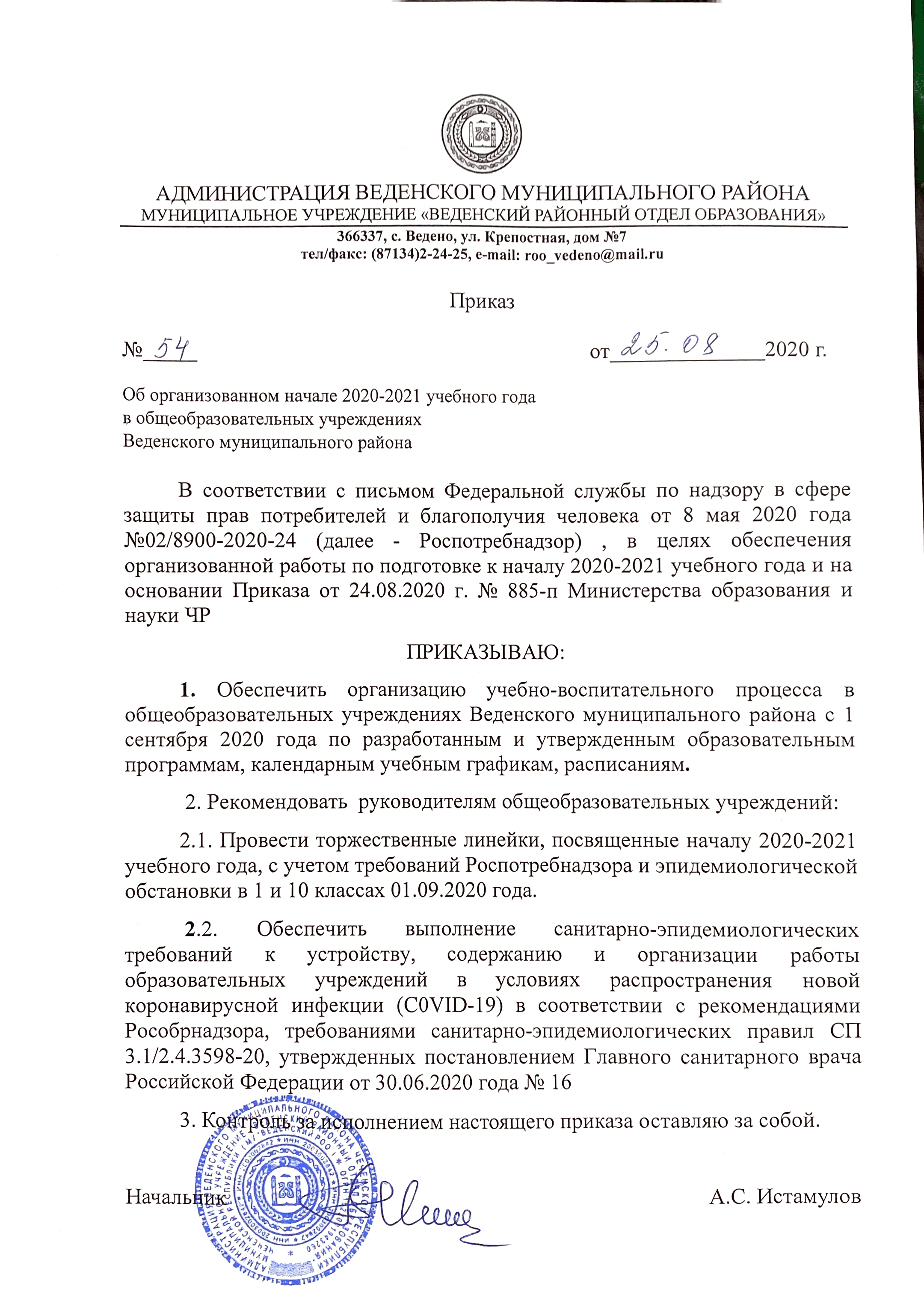 Приказ №54 по МУ "Веденский РОО" "Об организованном начале 2020-2021 учебного года в общеобразовательных организациях Веденского муниципального района".