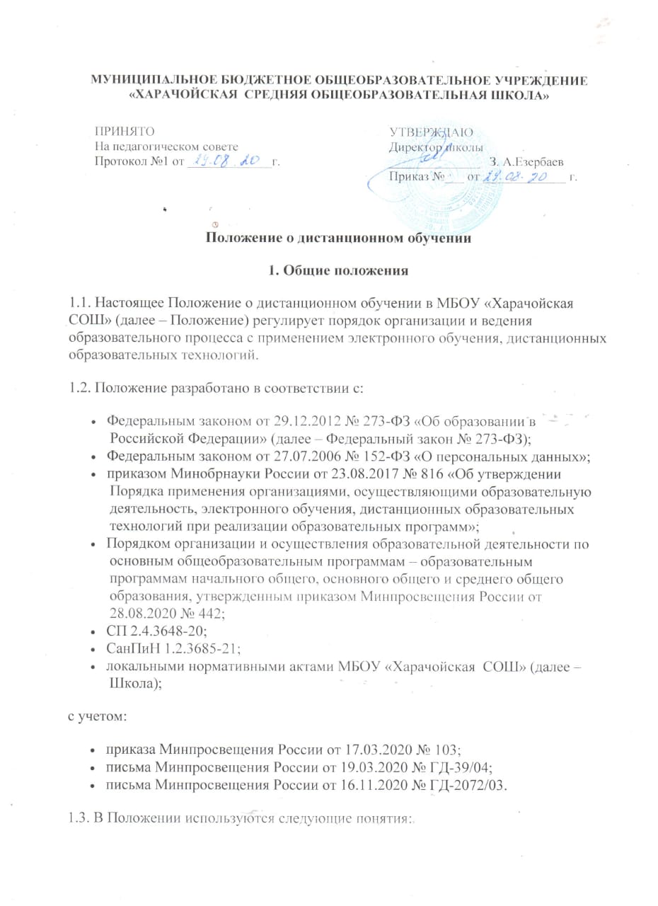 Приказ №61 по МБОУ "Харачойская СОШ" "Об организованном начале 2020-2021 учебного года в общеобразовательных организациях Веденского муниципального района".