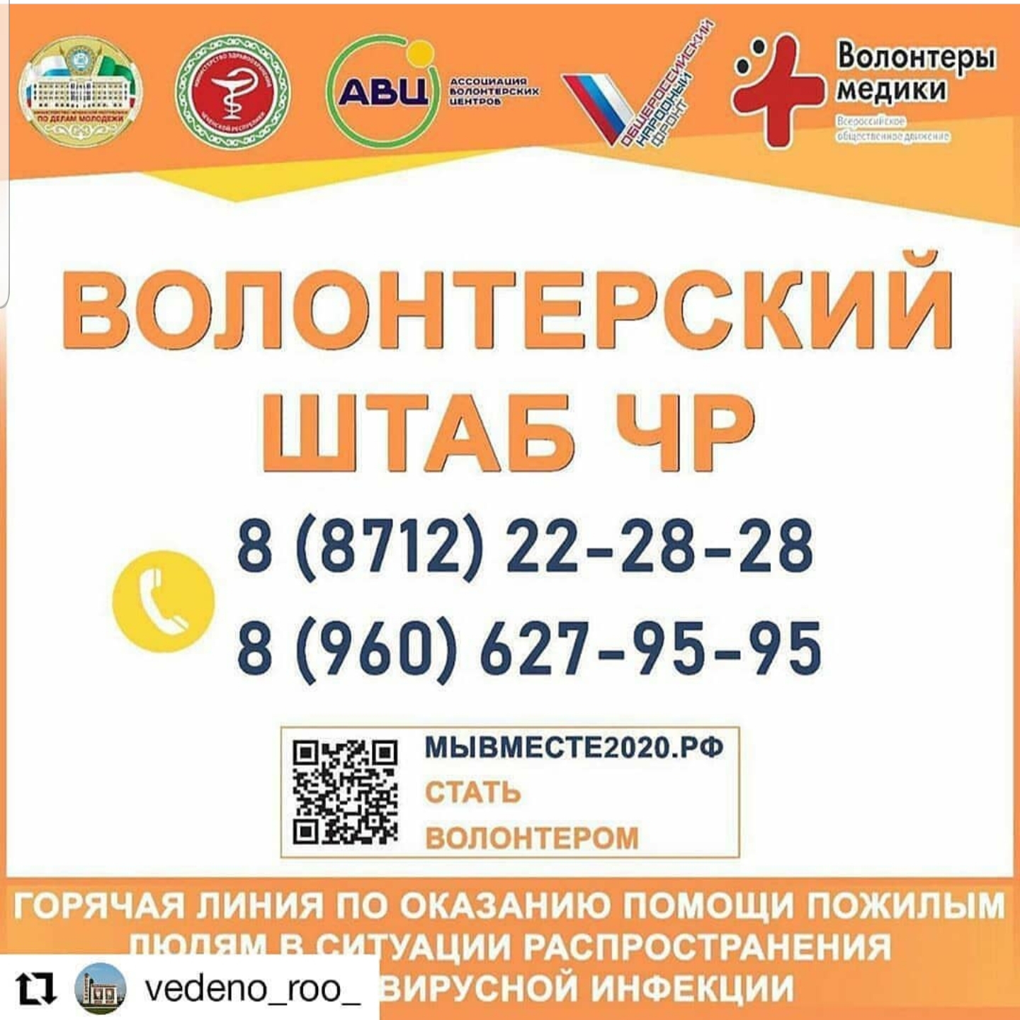 03.04.2020Министерством ЧР по делам молодёжи @isa_k669ra @minmolodezhi_95 совместно с Министерством здравоохранения ЧР @docsuleymanov_95 @minzdrav_95 и региональным отделением ВОД «Волонтёры-медики» @amerpema @volmedic95 создан единый колл-центр по оказанию помощи пожилым людям в ситуации распространения коронавирусной инфекции (Волонтерский штаб), задачей которого является организация волонтерской деятельности по оказанию помощи пожилым людям, оказавшимся на карантине, либо не имеющим возможности выйти на улицу. Волонтёрский штаб объединяет все волонтерские организации, университеты и некоммерческие организации, желающие оказывать помощь людям в данной ситуации. Особенностью организации добровольческой деятельности в неблагоприятной эпидемиологической обстановке является ограничение массовых мероприятий, минимизация контакта с пожилыми людьми, неукоснительное соблюдение санитарно-гигиенических норм и правил, четкая координация деятельности добровольцев с единым колл-центром, развитие онлайн-форматов помощи, синхронизация добровольческой деятельности с федеральным и региональными оперативными штабами по борьбе с коронавирусом, преобладание адресных форматов помощи людям, находящимся в режиме самоизоляции. Заявку на оказание помощи добровольцев можно направить по следующим номерам телефона единого колл-центра:
