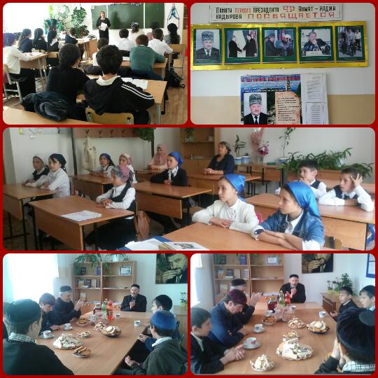 10.05.2016В школе были проведены ряд мероприятий, посвященных двум скорбным датам: депортации чеченского народа в 1944 году и гибели первого Президента Чеченской Республики Ахмат-Хаджи Кадырова во время военного парада 9 мая 2004 года. Были проведены тематические уроки. 10 мая прочитали мовлид, вспоминая всех погибших.