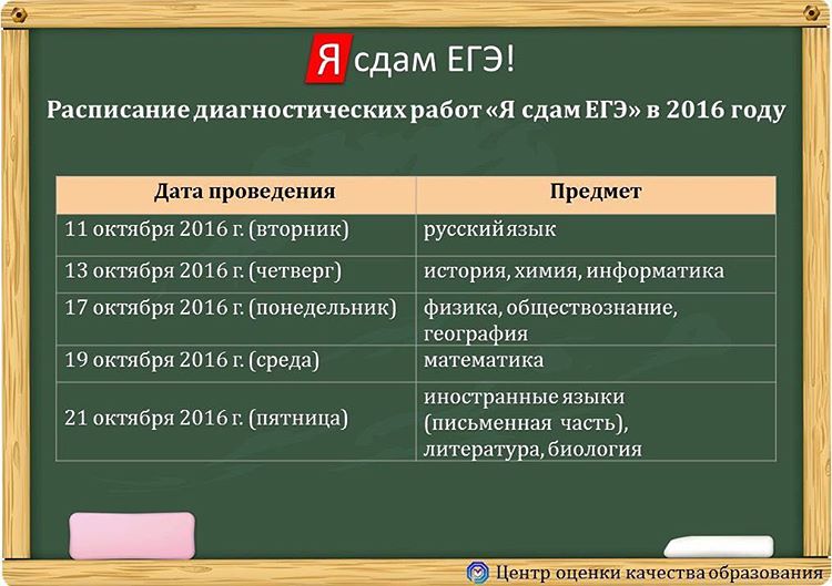 10.09.2016Представляем вашему вниманию расписание диагностических работ по проекту «Я сдам ЕГЭ!» на 2016 год. В отличии от прошлого учебного года в этом году в проект включены все общеобразовательные предметы, по которым сдается ЕГЭ. По каждому предмету планируется проведение трех диагностик.