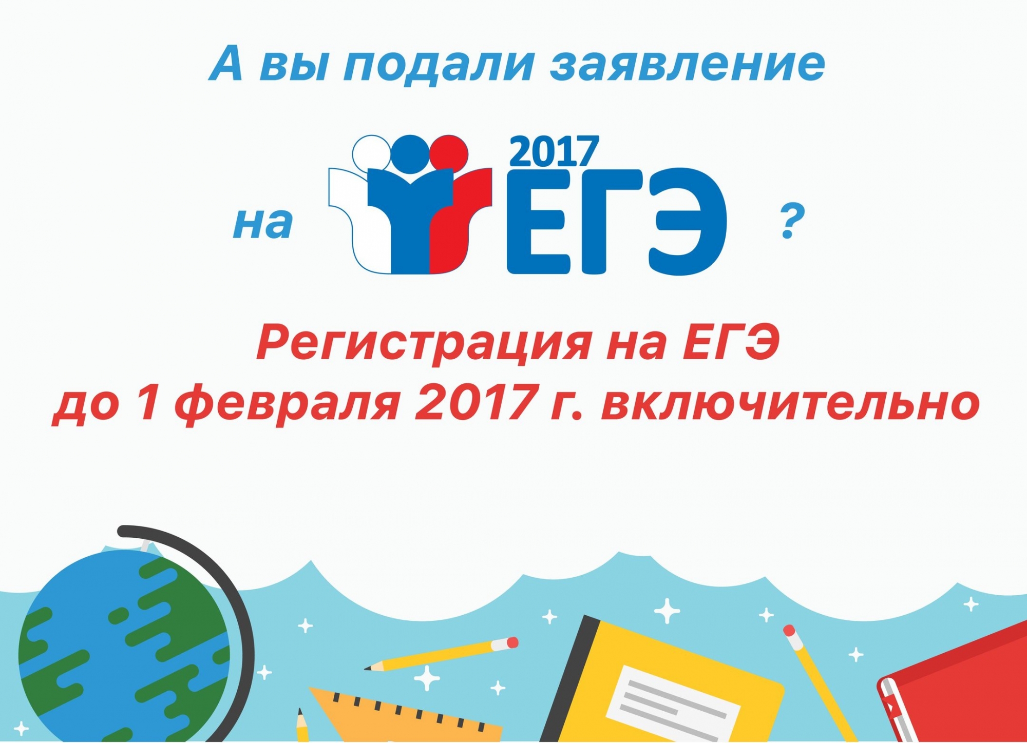09.01.2017Федеральная служба по надзору в сфере образования и науки напоминает, что заявление на участие в ЕГЭ 2017 года необходимо подать до 1 февраля (включительно). В заявлении должны быть перечислены предметы, по которым участник планирует сдавать ЕГЭ.