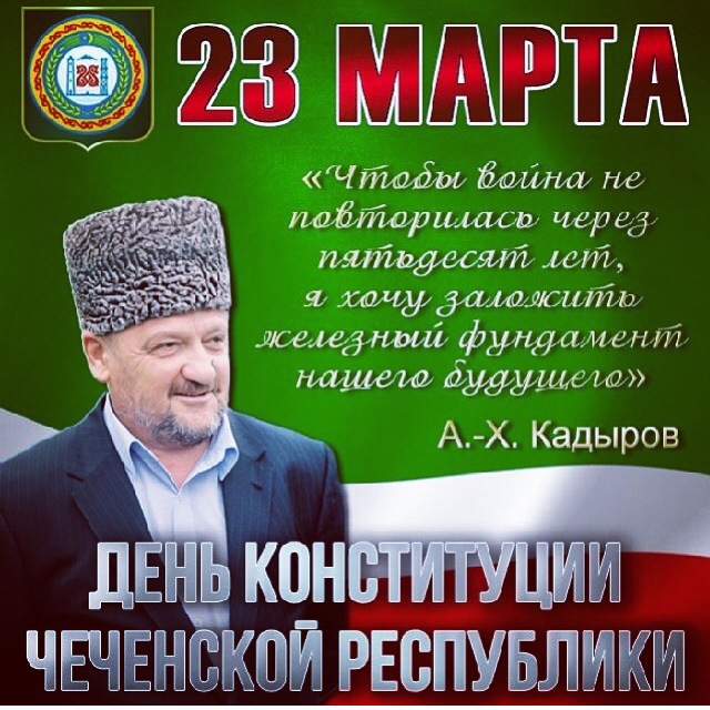 23.03.2017День принятия Конституции ЧР не только великий праздник возрождения Чеченской Республики и чеченского народа, но это еще и великая память о тех людях, которые стояли у его истоков. И прежде всего это первый Президент Чеченской Республики Ахмат-Хаджи Кадыров. Его мужество, мудрость способствовали тогда проведению референдума. Мы должны помнить эту дату и человека, благодаря которому наша республика восстала из пепла. Благодаря героизму Ахмат-Хаджи Кадырову мы сегодня живем в мирной и процветающей республике. Каждый из нас имеет право на образование, на свободное распоряжение своими способностями к труду, не говоря уже о свободе совести и праве на жизнь. Это и многое другое дарует нам Конституция ЧР, в которой указано, что источником государственной власти в Чеченской Республике является ее народ, являющийся частью многонационального народа Российской Федерации.