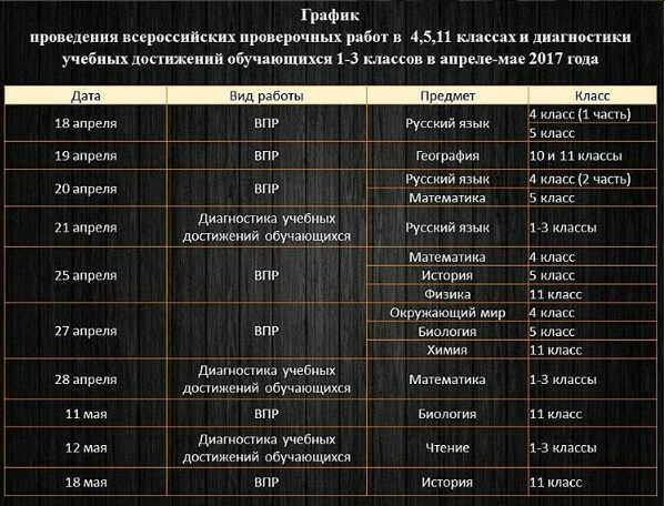 График проведения всероссийских проверочных работ в 4, 5, 11 классах и диагностики учебных достижений обучающихся 1-3 классов в апреле-мае 2017 года.
