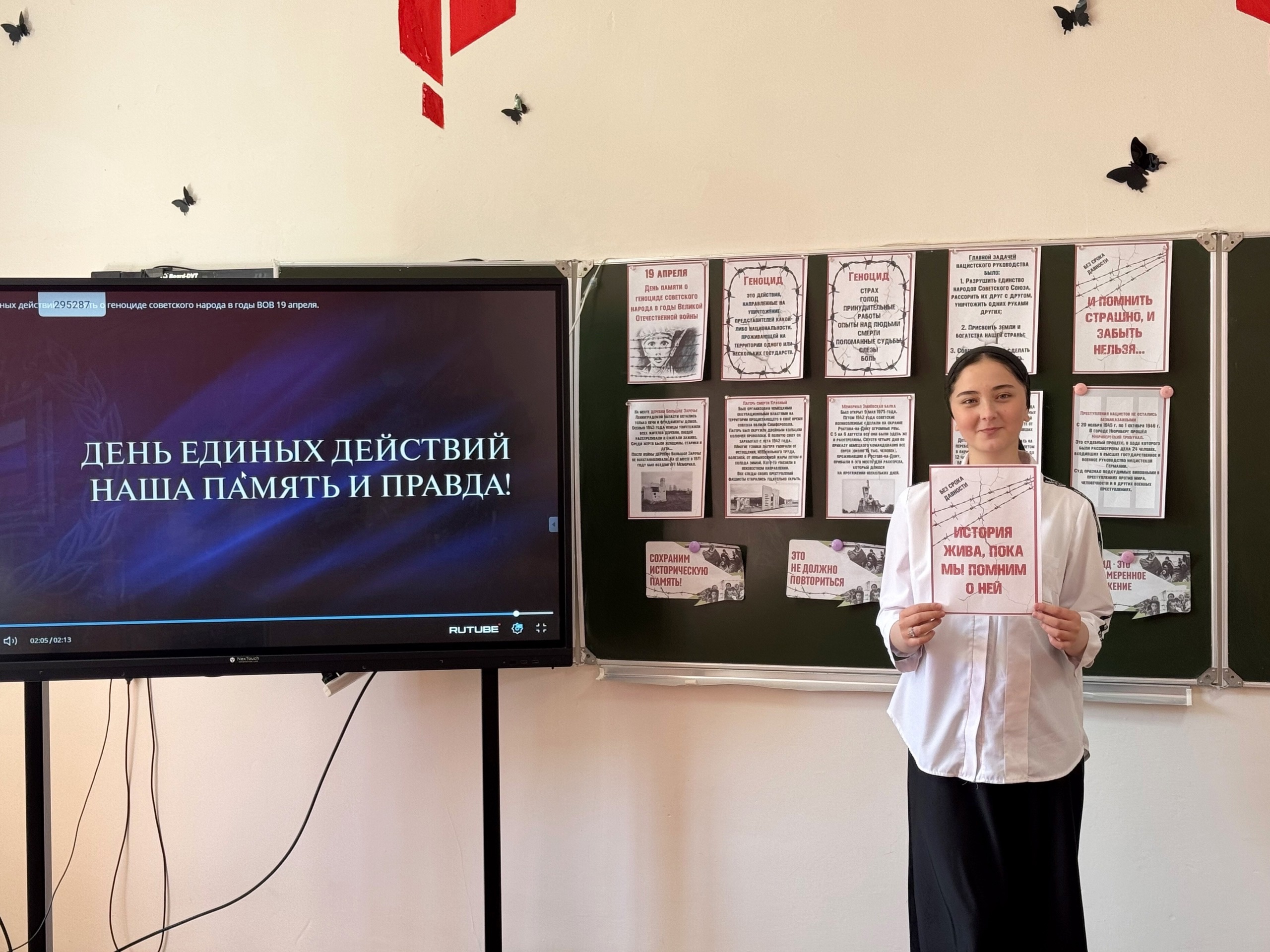 19.04.2025Ежегодно 19 апреля по всей стране отмечается День единых действий в память о геноциде советского народа, совершённом нацистами и их пособниками в годы Великой Отечественной войны.В этот день мы не просто вспоминаем о тех трагических событиях, но и объединяемся в борьбе с любыми современными проявлениями нацизма и геноцида. Эта дата напоминает нам об одной из самых значимых страниц в истории нашей страны — Великой Отечественной войне, которую невозможно забыть.В преддверии этого дня в МБОУ «Харачойская СОШ» проведены мероприятия советником директора по воспитанию Зулкарнаевой Ж. И.Урок мужества, разработанный проектом «Без срока давности», посвящён Дню единых действий в память о геноциде советского народа, осуществлённом нацистами и их пособниками в годы Великой Отечественной войны.Учащимся были представлены видеоматериалы проекта «Без срока давности», рассказывающие о зловещих преступлениях нацистов против мирного советского населения.Было кратко изложено о концлагерях Германии, в которых сотни тысяч советских граждан были безжалостно уничтожены фашистами: Освенцим, Дахау, Майданек, Бухенвальд.
