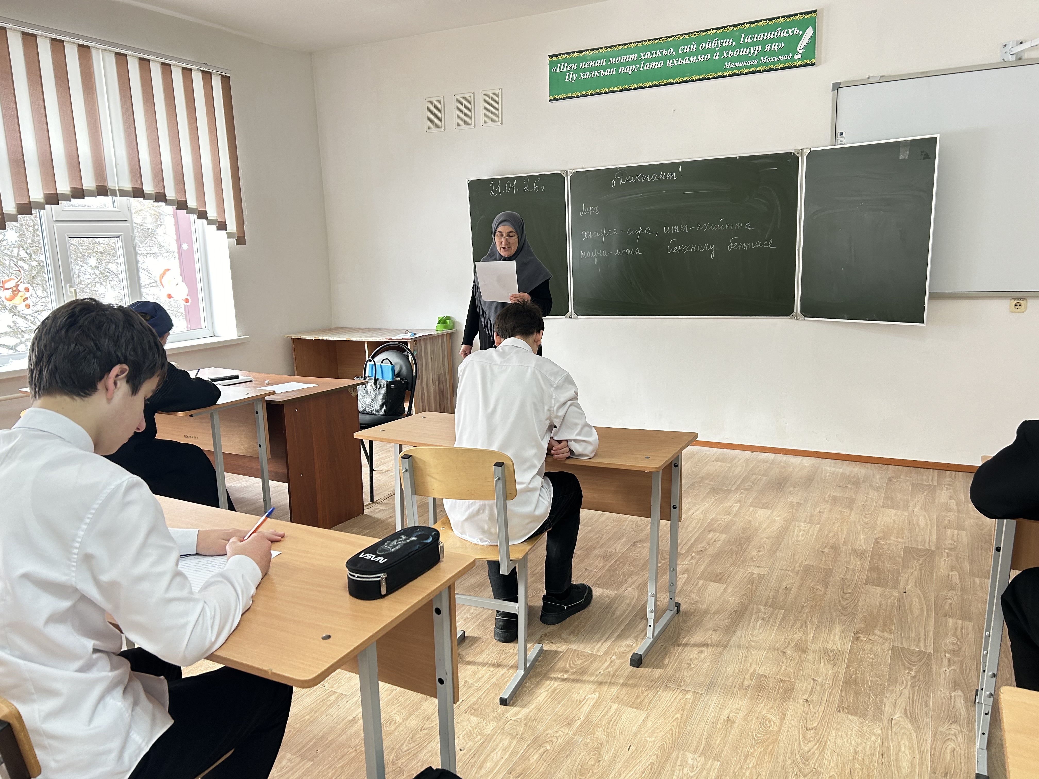21.01.2026Учащиеся 8 класса МБОУ «Харачойская СОШ» приняли участие в региональном диктанте по чеченскому языку. Ребята с ответственностью и старанием выполнили задания, продемонстрировав хорошие знания родного языка, внимательность и стремление к высоким результатам. Проведение подобных мероприятий способствует сохранению и развитию чеченского языка, формированию уважительного отношения к культурному наследию и повышению интереса обучающихся к изучению родного языка. Желаем нашим ученикам дальнейших успехов и отличных результатов!