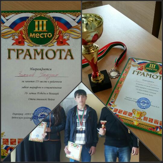 Закаев Рамзан, ученик 9 класса, занял 3 место в районном забеге-марафоне в ознаменование 70-летия Победы в Великой Отечественной Войне. Ему вручили кубок, медаль и грамоту за победу. Поздравляем и желаем дальнейших успехов!