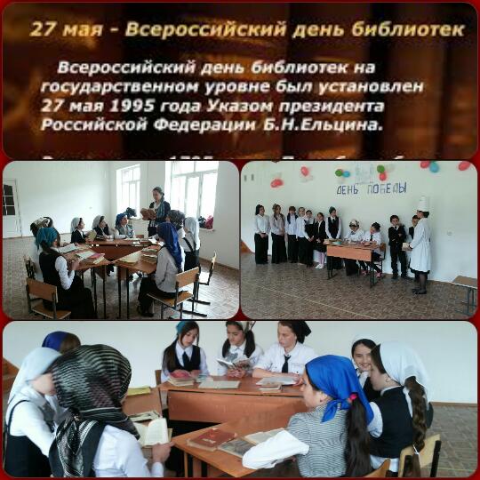 23.05.2015с 15 по 22 мая в школе прошли мероприятия в рамках подготовки и празднования Всероссийского дня библиотек. Наш школьный библиотекарь Файзулаева Аминат Элиевна рассказала учащимся о истории нашей библиотеки, провела экскурсию в сельскую библиотеку. Учащиеся подготовили сценку "Как Айболит лечит книги", также было рассказано много стихов, пословиц и загадок о книгах.