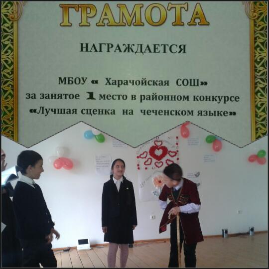 Учащиеся 5-го класса - Пайзулаева Шовда, Тимирбулатов Мансур, Солтагиреев Ислам - заняли 1 место в районном конкурсе "Лучшая сценка на чеченском языке". Желаем им дальнейших успехов!!!